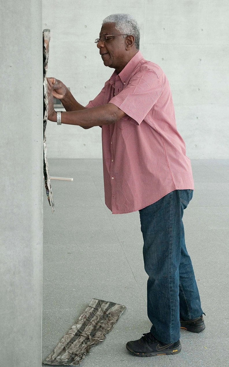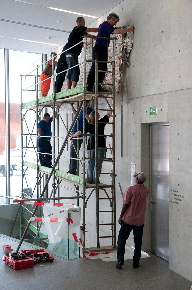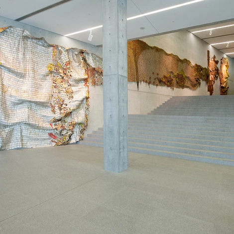 When El Anatsui visited Basel in July 2011 for the installation of Tismemskiblo, there were two huge crates standing in the entrance hall of the Ando building. Inside them, the artwork lay folded and layered in loose fragments of varying sizes. These parts were spread out on the floor, measured, linked together with copper wire, and shaped to purpose. Right up to the moment when the installation was completed, the artist continued to make compositional changes to the assemblage, adding volume to individual areas and allowing the fabric of the piece to fold and drape freely according to the inherent qualities of the material and its texture, as though it had simply been hung quite casually on the wall.