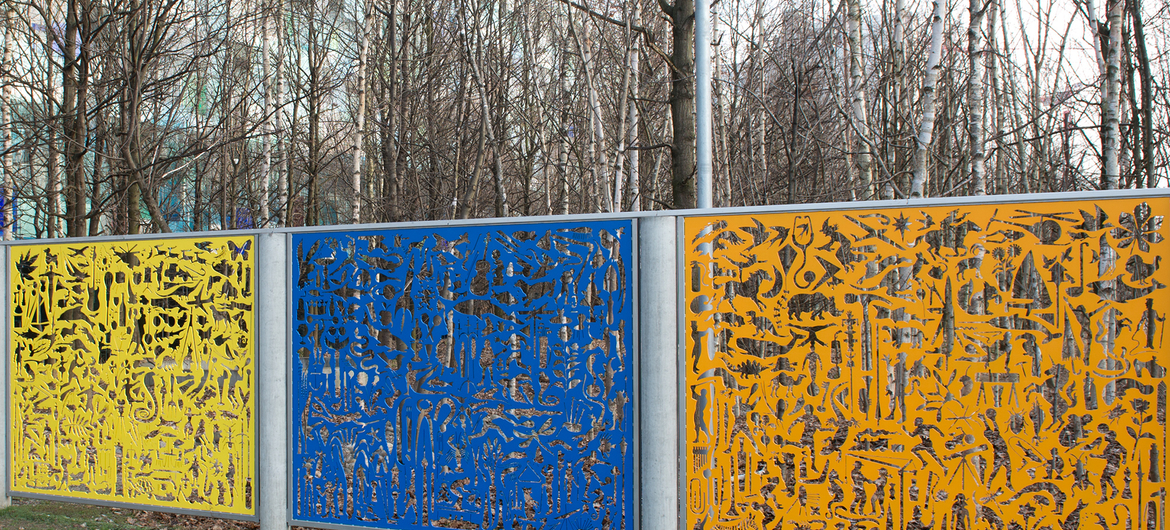The Wonderwall is a stretch of fence, featuring a series of five steel panels elaborately decorated with lyrical motifs. Alan asked British illustrator Andrew Davidson to create over 1000 images inspired by Victorian motif books, each of which was later lasered out of ten-millimeter-thick steel sheet. Looking closely at the panels one can observe a galloping cowboy with an arrow through his hat takes aim at a witch on a broomstick, and both are dwarfed by the silhouette of a large hammer. Scenes like this seem to mingle and move among other motifs, and shift from panel to panel. Fletcher envisioned parents with their children playing with the characters and elaborating stories based on favorite figures and motifs.
