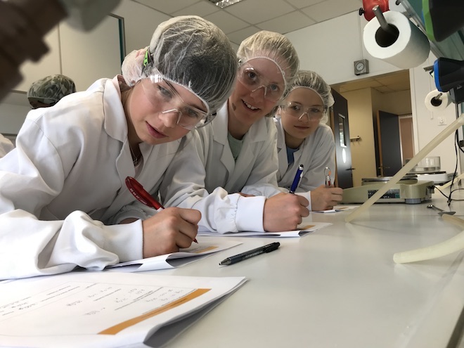 Höhepunkt des Tages war die praktische Arbeit. Ausgestattet mit Labormantel und Schutzbrille starteten die jungen Teilnehmerinnen ins Labor und waren sichtlich begeistert von den Möglichkeiten, so etwa der Herstellung eigener Kosmetika, chemisch/physikalische Experimente und Qualitätskontrolle von Rohstoffen.