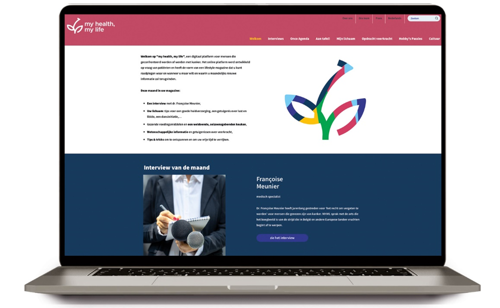 ‘my health, my life’ (www.mhml.be) est une initiative innovante, née de la recherche de ce qui manque parfois aux malades durant leur traitement, en période d’invalidité ou même après, dans leur vie de tous les jours. Les patients parlent certes de leur fatigue et de leurs coups de mou au moral mais aussi de leur envie de se distraire, d’apprendre, de se faire du bien, de rester en contact avec le monde extérieur, d’entendre les témoignages et les vécus d’autres malades, sans nécessairement devoir se déplacer ou adopter une démarche interactive. Des patients, hommes et femmes de tous âges, peuvent parcourir cette plateforme comme un magazine. Les différentes rubriques seront enrichies chaque mois de nouvelles publications. Durant quelques minutes ou plus d’une heure, depuis son fauteuil, sa cuisine ou en attendant un rendez-vous, sur son ordinateur, son écran de télévision connecté, sa tablette ou son smartphone, chacun pourra accéder à ce rendez-vous avec la vie, au-delà du cancer.