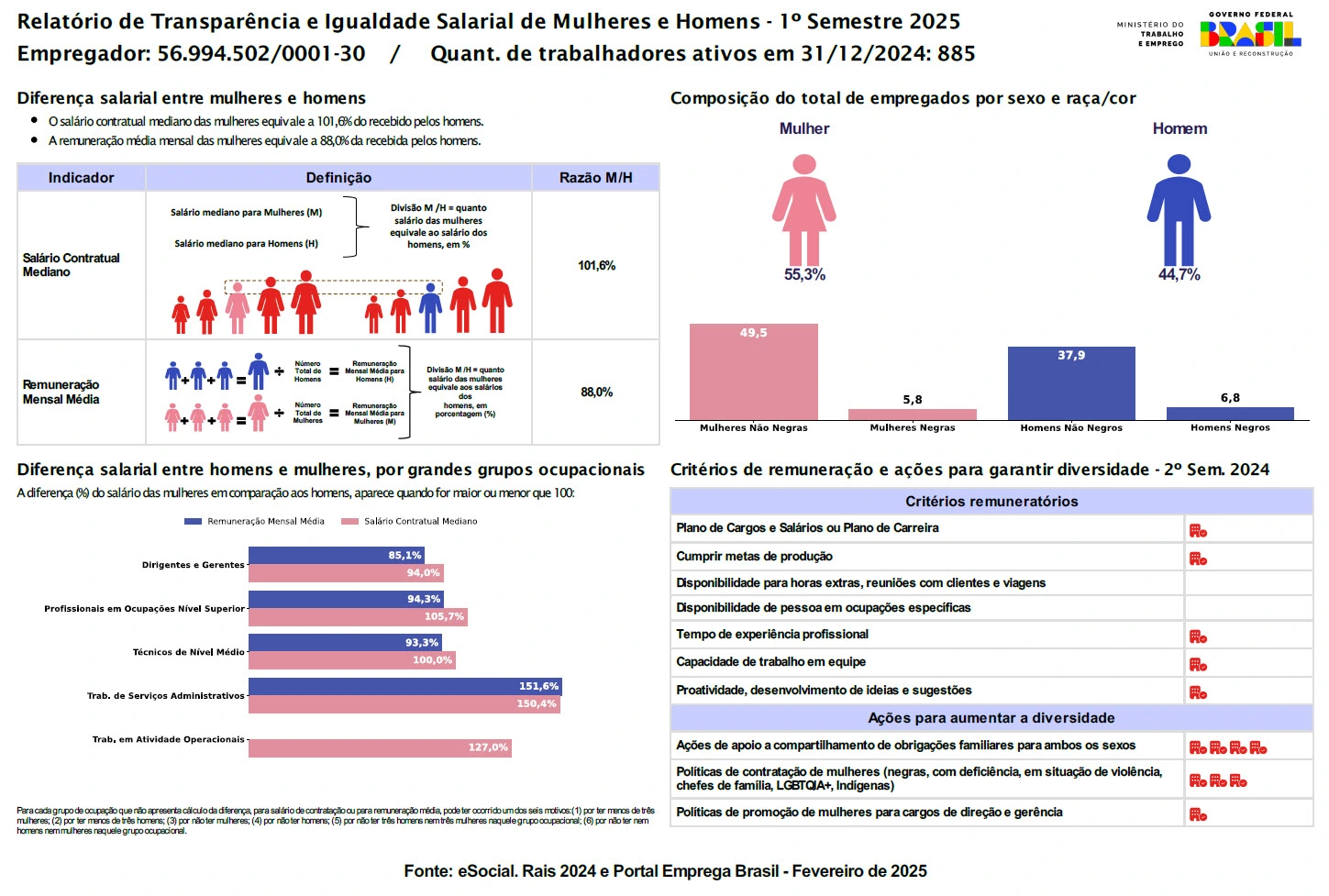 Com base na Lei nº 14.611, sancionada em 3 de julho de 2023, que aborda a igualdade salarial e de critérios remuneratórios entre mulheres e homens no ambiente de trabalho e determina a publicação semestral do relatório fornecido pelo Ministério do Trabalho e Emprego (MTE) para empresas com 100 ou mais empregados, a Novartis Brasil apresenta seu relatório com base nas informações do eSocial, com métricas estabelecidas pelo governo a partir de agrupamentos de cargos e funções equivalentes: