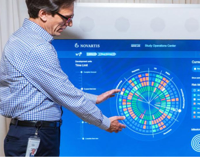 Lors de la troisième étape, des modules utilisateurs ont été créés pour rendre les résultats de l’analyse, y compris les données contextuelles, intelligibles pour les équipes et générer une valeur ajoutée pour les processus décisionnels de l’entreprise. Cinq modules ont été générés jusqu’à présent et l’équipe est déjà attelée à la série suivante. Ainsi, le Trial FootPrint Optimizer aide notamment les équipes de développement à planifier et à simuler des scénarios pour les études cliniques. A l’avenir, par exemple, il sera possible de sélectionner les meilleurs centres, de suivre et de prévoir le recrutement des patients. Un autre module sert de « tour de contrôle » pour les études cliniques, et est appelé Sense. Sense est conçu pour être commandé à partir d’une salle centrale équipée de grands écrans et de ses propres postes de travail. Cette plateforme assistera le portefeuille d’essais cliniques en cours de développement en temps réel, en prédisant les risques de l’essai et leurs moteurs afin de permettre des modifications et améliorations préventives. Sense fournit également un cadre de collaboration et de données et permet, à l’aide de données, de mener à bien des conversations transparentes entre les équipes qui mènent des essais cliniques de Novartis dans le monde entier.
