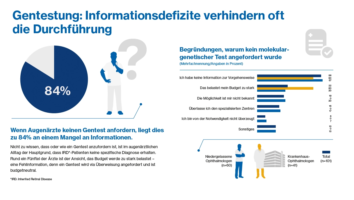 Eine von Interrogare durchgeführte repräsentative Umfrage unter 101 niedergelassenen und klinisch tätigen Ophthalmologen hat u.a. gezeigt, dass auch bei den Spezialisten Informationsdefizite bestehen – besonderes im Hinblick auf die Diagnostik bei erblichen Netzhauterkrankungen mittels Gentest: Wenn Augenärzte keinen Gentest anfordern, liegt dies zu 84% an einem Mangel an Informationen. 58% der befragten Ophthalmologen wünschen sich mehr Informationen zur Testung.3