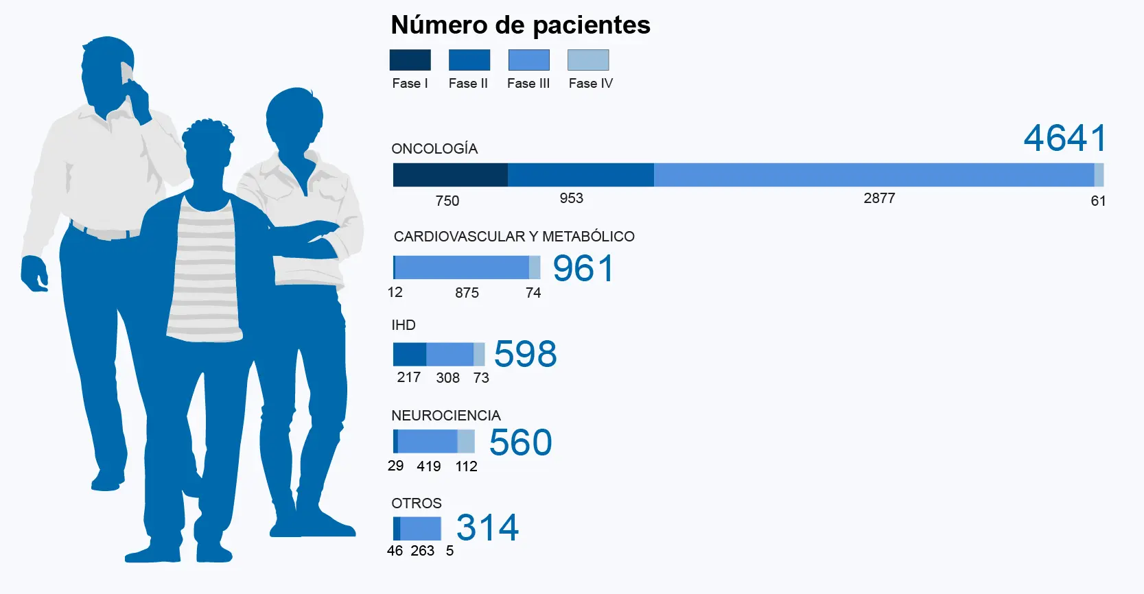 Los estudios se realizan para determinar si un nuevo tratamiento es seguro y eficaz y, además, son posibles gracias a personas que deciden participar de forma voluntaria. En 2022, un total de 7.074 pacientes contribuyeron en los 242 estudios realizados durante el año en las áreas terapéuticas de oncología, cardiología, IHD (Inmunología, Hepatología y Dermatología), neurociencia, y otras como oftalmología y respiratorio. La mayoría se concentró en las fases tempranas (I y II), las que denotan más innovación.