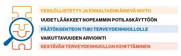 MITÄ TARVITAAN: Lainsäädäntö ja tiedon hallinnoinnin käytännöt tukemaan tutkimuksen tekemistä, tietoallasratkaisujen kehittäminen, tekoälyosaaminen ja teholaskentakapasiteetti saumattomasti tukemaan tutkimuksia, yksilöllistetyn lääkehoidon kehittäminen, yksityisten ja julkisten toimijoiden avoin yhteistyö.