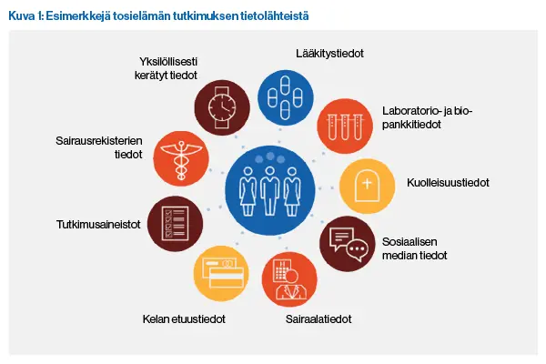 Suomessa on tehty pitkäjänteistä työtä terveystietojen keräämiseksi ja sen käytön edistämiseksi. Tosielämän tietoon perustuvassa tutkimuksessa hyödynnetään mm. kansallisten rekistereiden tietovarantoja, sairaaloiden tietoaltaita tai yksilöiltä itseltään kerättyjä hyvinvointitietoja (kuva 1). Tällaiset tutkimukset täydentävät kliinisten tutkimusten näyttöä ja ovat tärkeä osa terveydenhuollon toimijoiden päätöksentekoa sekä hoitokäytäntöjen kehittämistä (kuva 2).