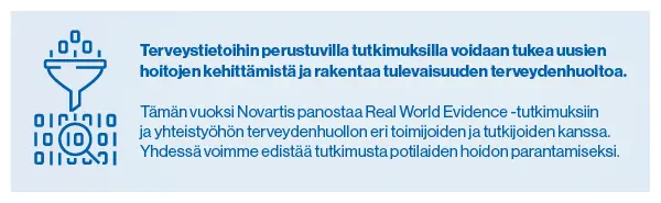Novartis panostaa Suomessa RWE- eli tosielämän tietoon perustuviin tutkimuksiin, joissa hyödynnetään kliinisten tutkimusten ulkopuolella kerättyjä tietoja. Näihin tutkimuksiin liittyy tyypillisesti eri sosiaali- ja terveydenhuoltojärjestelmiin kerätyn tiedon toisiokäyttö, jossa tietojen käsittely tapahtuu tietoturvallisessa ympäristössä eikä yksittäistä henkilöä voida tunnistaa kerätystä aineistosta. Teemme RWE-tutkimuksia edistääksemme parempien hoitojen kehittämistä ja tuottaaksemme arvoa potilaille ja terveydenhuollolle.