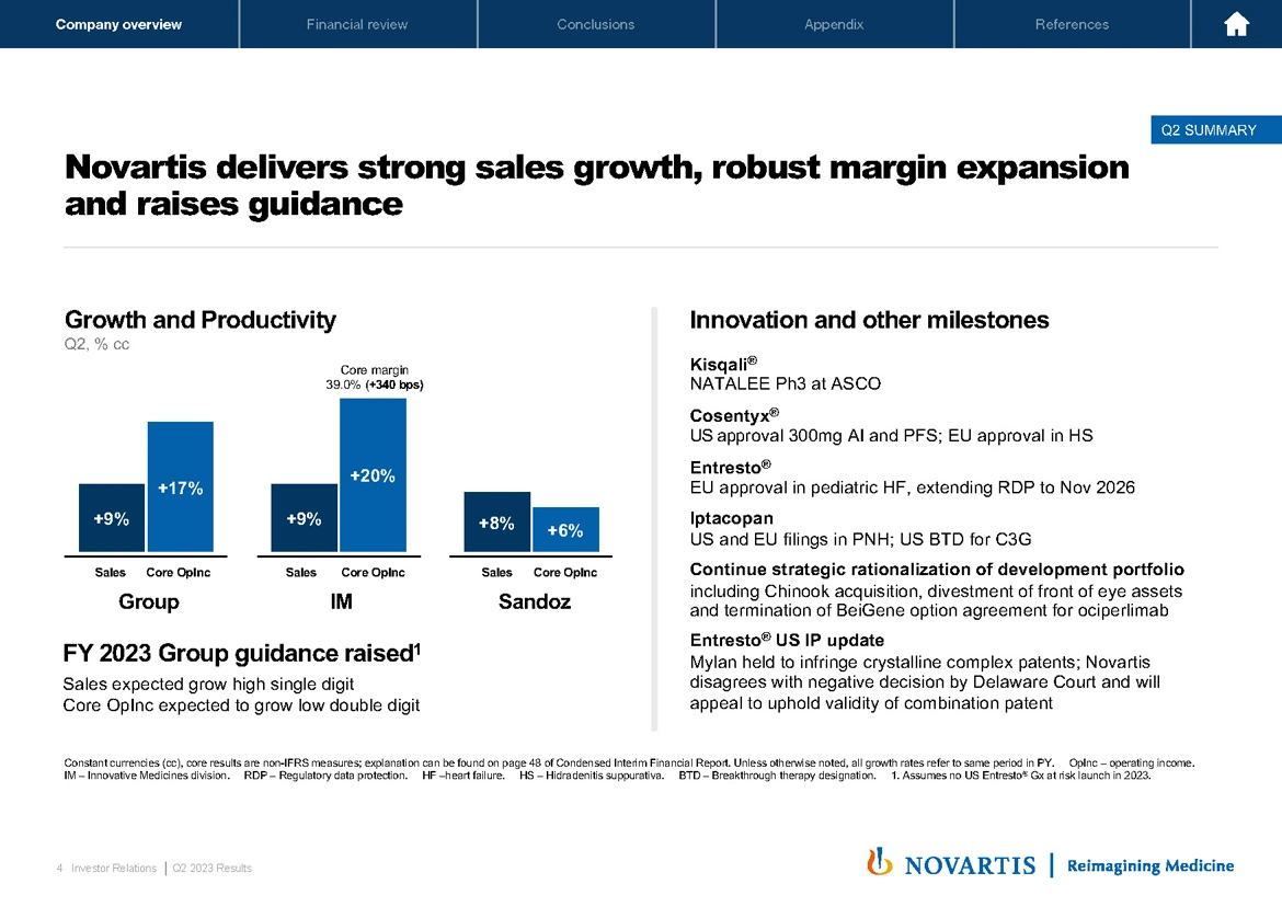 So let's move straight to Slide 4. And as you saw in our release earlier today, Novartis delivered strong sales growth, excellent margin expansion, and we were able to raise our full year guidance. Getting into the numbers, our group sales grew at 9% and core op inc at 17%. IM sales were up 9% and core op inc up 20%, allowing us to drive our IM margin to 39%. And Sandoz sales were up 8% and core op inc up 6%. Harry will go through the guidance in more detail, but as you saw, we raised our full year guidance for both sales and core operating income.