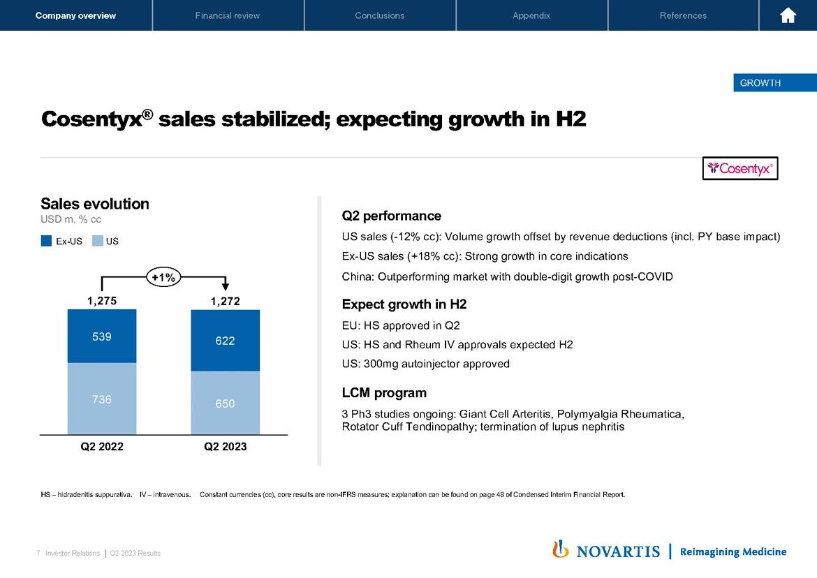 Ex-US sales were up 18% across – with growth across all of our core indications. And importantly, in China, we're seeing outperformance versus the market with double-digit growth, as the China health care systems continue to stabilize. Now when you outlook to the second half, we expect important pipeline milestones with hidradenitis already approved in the EU. In the US, we expect to get approvals of both HS and R-IV formulation, which would allow us to penetrate the Part B segment with respect to Cosentyx®, with rheumatologists who continue to use IV formulations of these medicines.