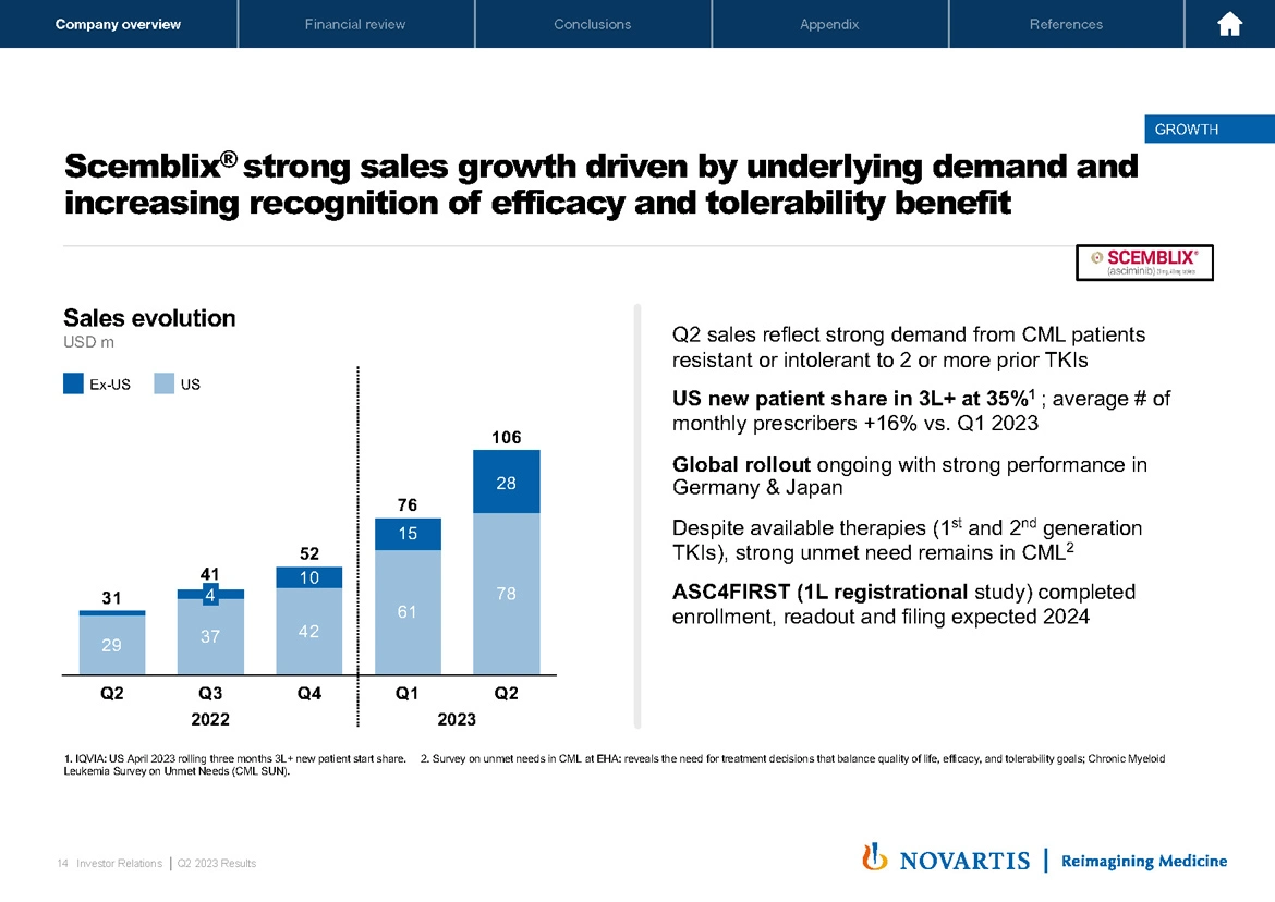 Now looking at Scemblix® sales. Scemblix® sales were strong in the quarter. This brand continues to outperform our internal expectations. Sales reached USD 106 million in the quarter. This is driven by our new patient share in the third-line setting, where we've reached now 35%, and we've had a 16% increase of monthly prescribers on the brand, as well as the global rollout of the medicine in Germany and Japan.