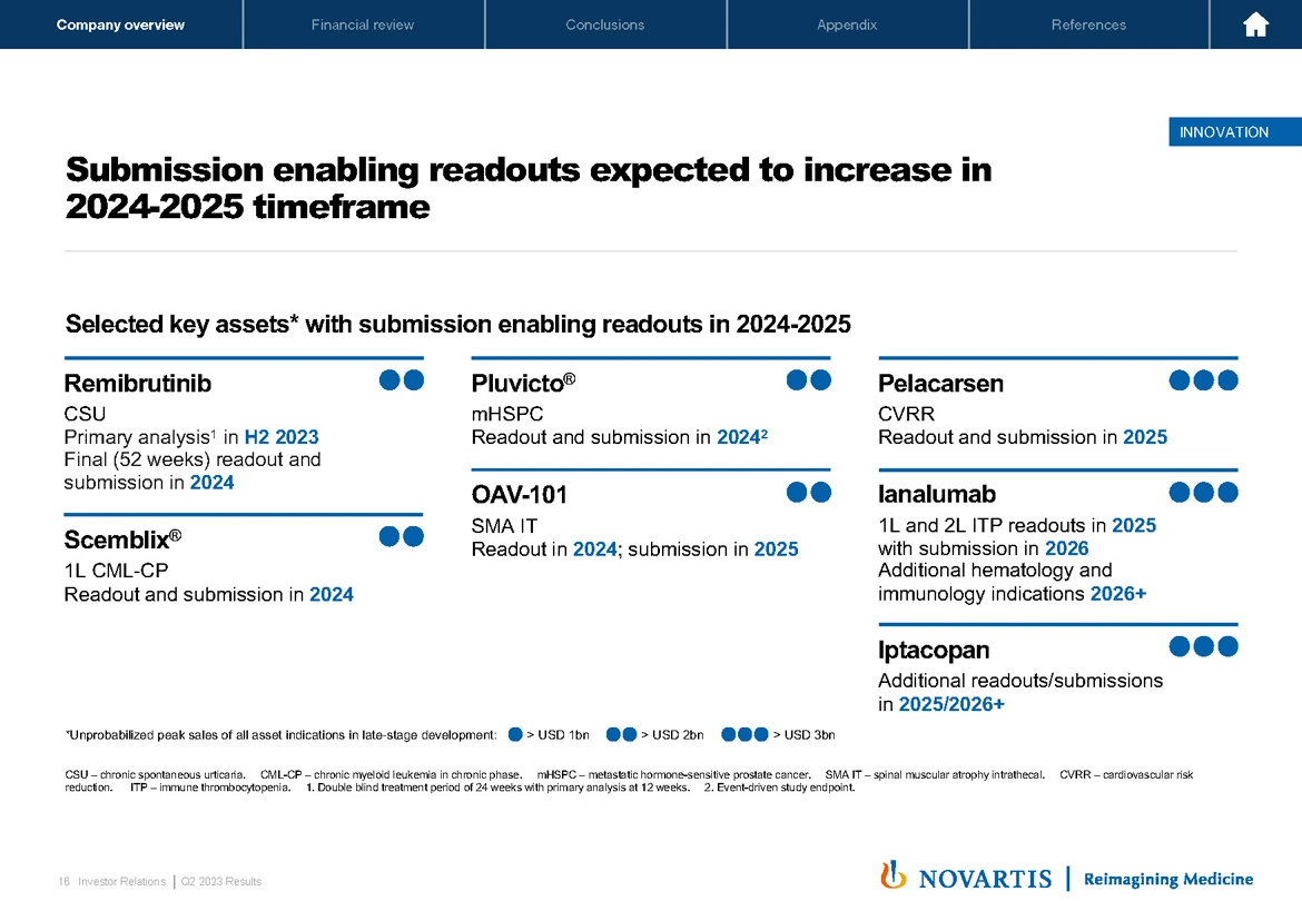 Now turning to the next slide. When you look ahead now to the potential readout that we have – expected readouts we have in the 2024, 2025 time frame, these also are on track. Remibrutinib will have its primary analysis in CSU, chronic spontaneous urticaria, in the second half of this year, with the final 52-week readout required for regulatory submission in the US in 2024. I've already covered Scemblix® and Pluvicto®.