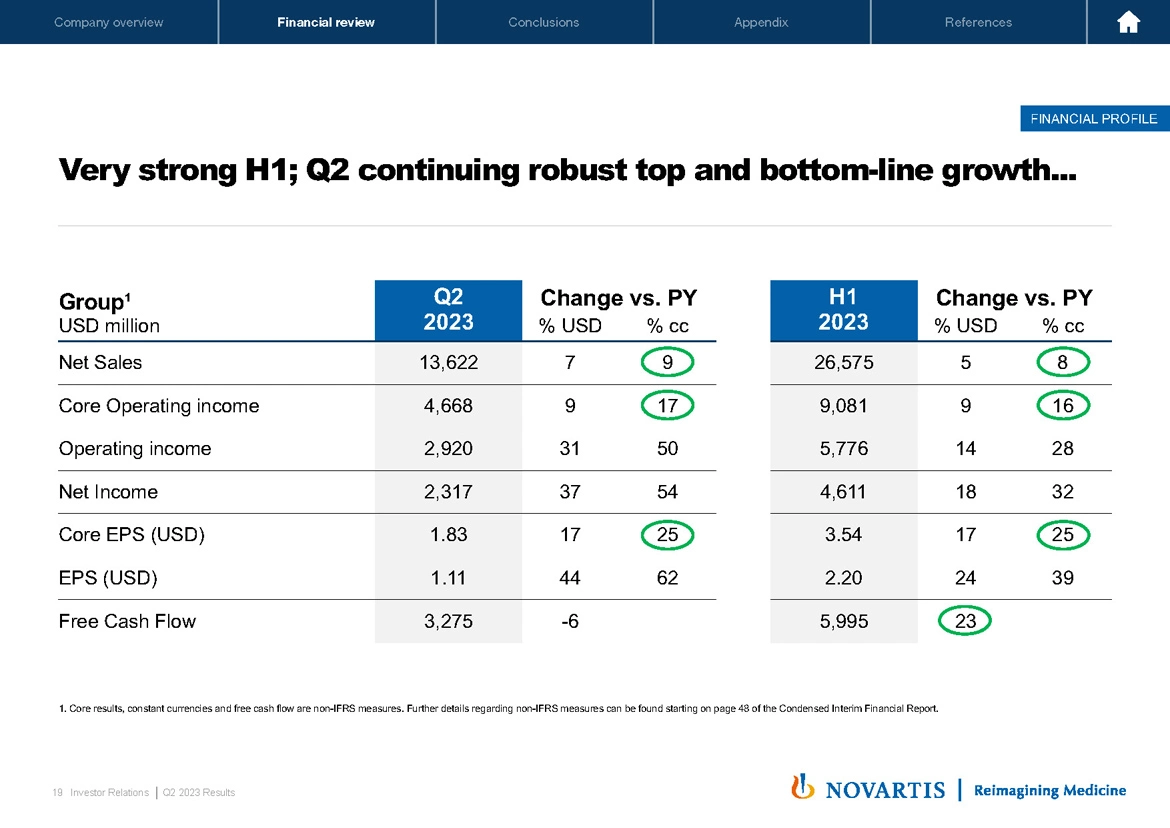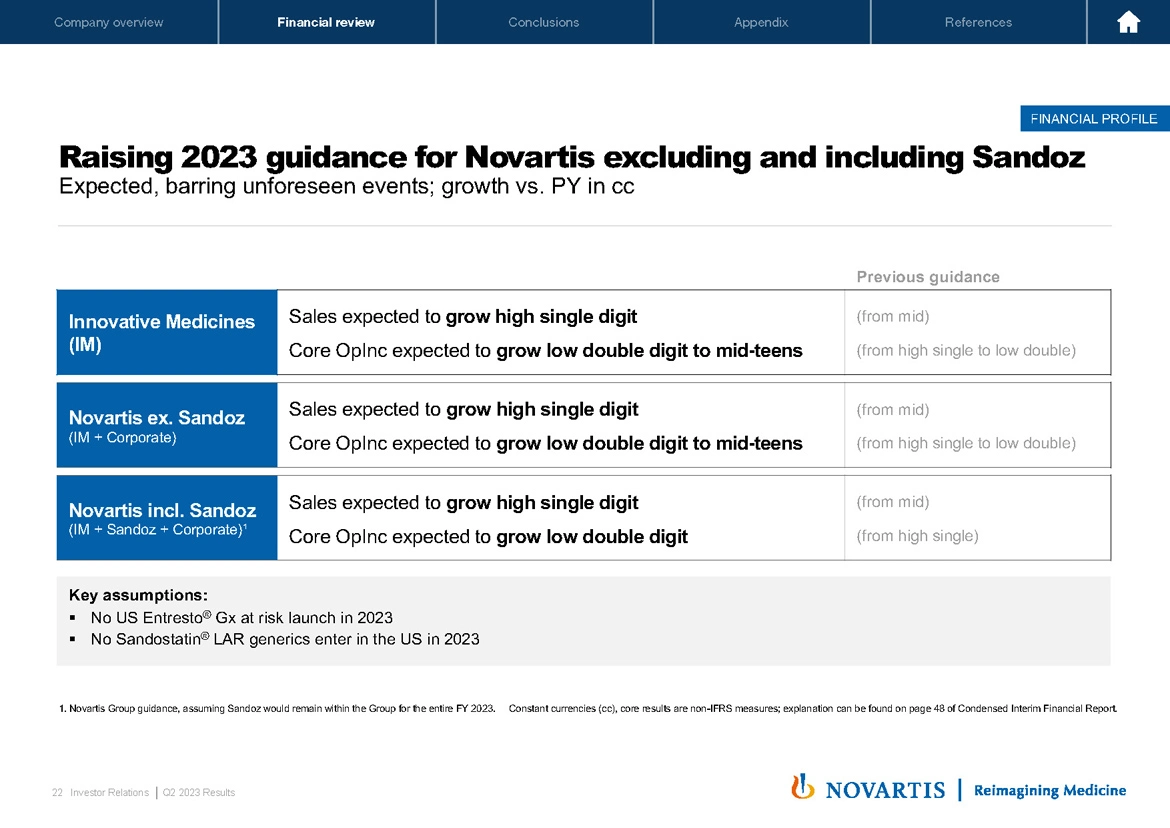 Now to Slide 22, please. The continued strong performance so far and confidence in our future growth allows us once again to raise both top and bottom line guidance for the full year of 2023. So for Innovative Medicines and Novartis, excluding Sandoz, we now expect sales to grow high single digit and core operating income to grow low double digit to mid-teens. For Novartis including Sandoz, which is a group guidance and assuming that Sandoz would remain within the group for the entire 2023, we now expect sales to grow high single digit and core operating income to grow low double digit.
