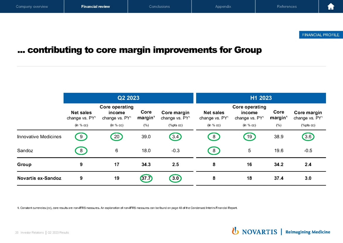 On the next slide, Slide 20. I want to go into a bit more detail about the performance of Innovative Medicines and Sandoz. For quarter 2, Innovative Medicines sales grew 9%, which drove an increase in Innovative Medicines core operating income of 20%. Core margin improved 340 basis points versus prior year for the quarter, reaching 39% in quarter 2 for Innovative Medicines.