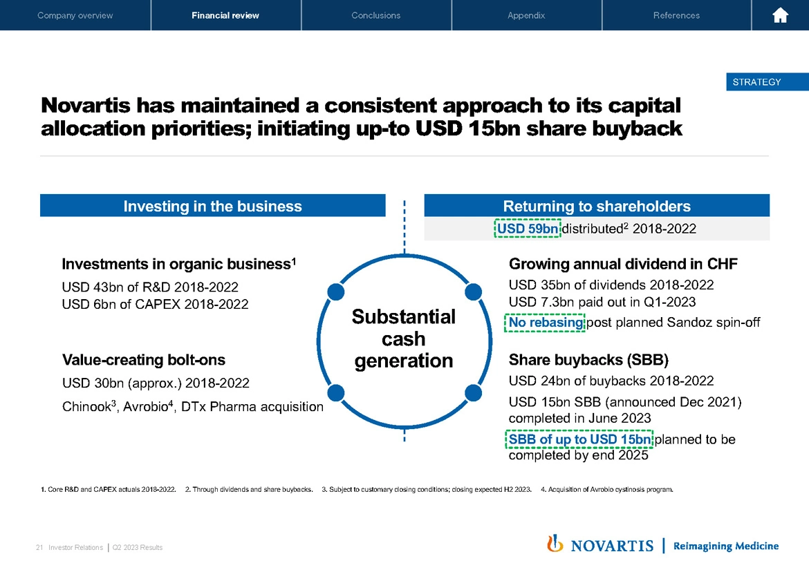 And of course, in that planning, we always have still flexibility for executing our bolt-on M&A and BD&L strategy over the years. So all of that is simply a normal continuation of our capital allocation strategy, built on a very strong balance sheet. As you may know, our net debt is just USD 15 billion. So it's below 1x EBITDA. It's a very strong balance sheet there. We have strong cash flows. And from that standpoint, I think it's just a logic way to continue share buyback at the same time, of course, a growing dividend in Swiss franc per share for the Novartis ex Sandoz. Not rebasing after Sandoz spin, and then Sandoz will pay another dividend on top of that.