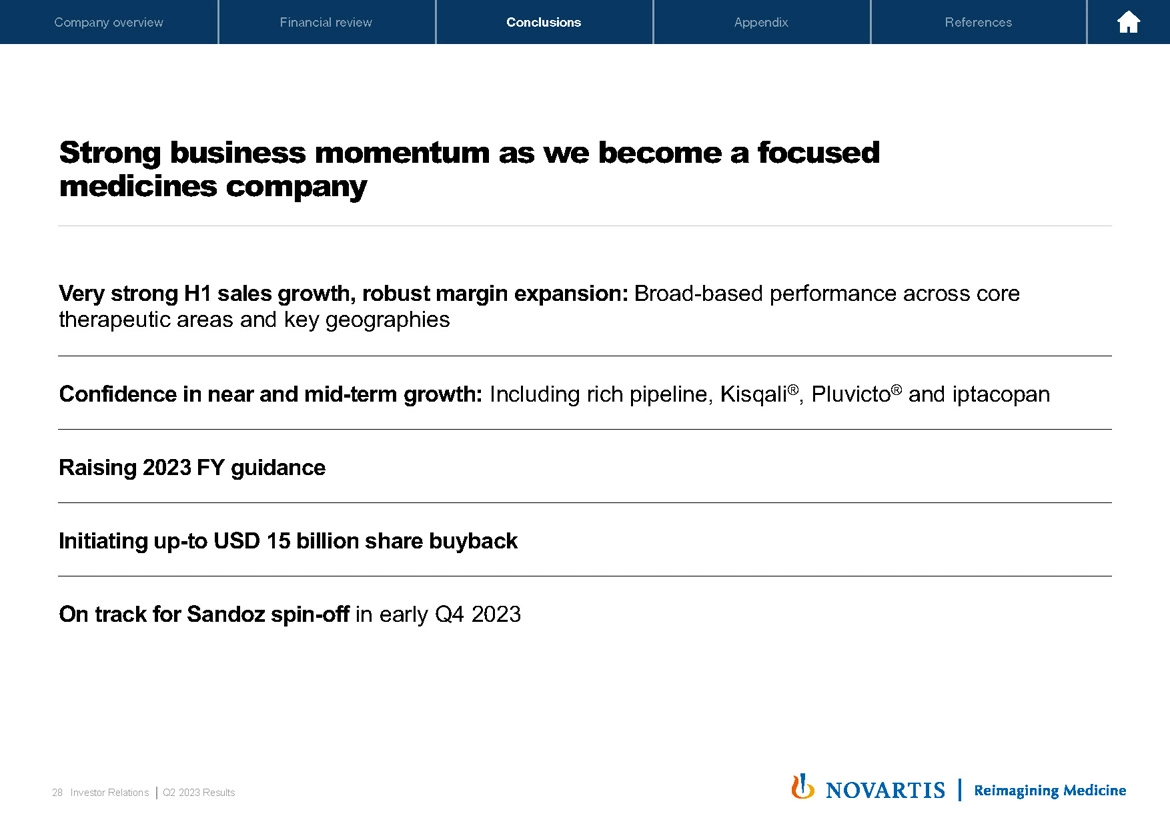 So moving to Slide 28. So you can see in the quarter that we demonstrated strong business momentum as we are really now well on our way to becoming a truly focused Innovative Medicines company. Very strong half 1 sales growth, robust margin expansion and that broad-based performance was across TAs and geographies. We remain very confident in our near and midterm growth profile, including our pipeline, Kisqali®, Pluvicto®, iptacopan, as well as the continued performance of our other launch brands such as Kesimpta® and Leqvio®. We're raising our 2023 full year guidance. We are initiating, based on our confidence in our outlook and in our company, a USD 15 billion share buyback. We're on track for the Sandoz spin-off in early Q4 2023. So with that, we can open the line for questions. One question per analyst, please. Sharon?
