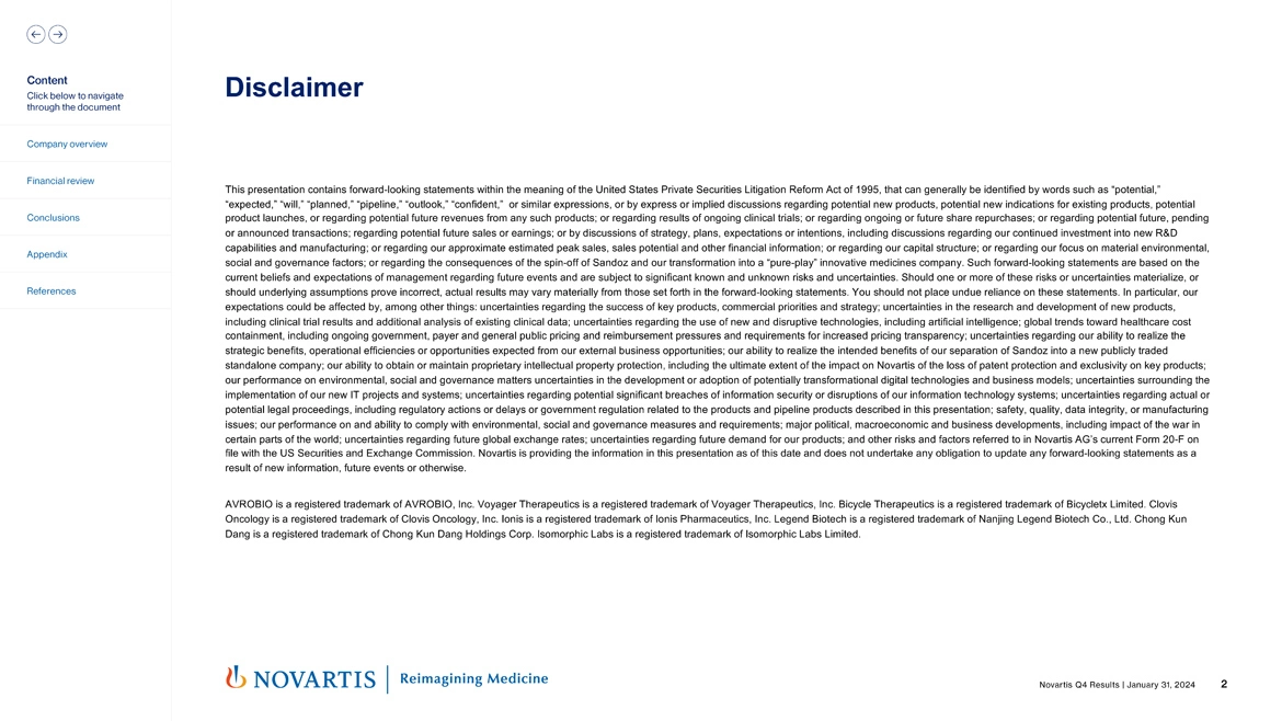 Yes. Thank you very much, Vas. Good morning and good afternoon, everybody. I'm now going to walk you through some of the financials for the fourth quarter and full year as well as provide you with our 2024 guidance. As always, my comments refer to growth rates in constant currencies, unless I would otherwise note that. Also throughout the presentation, I'm only going to talk about continuing operations. And just as a reminder, that continuing operations include retained business activities of Novartis, comprising of our Innovative Medicines business and the continued corporate activities. Discontinued operations include Sandoz and selected portions of corporate activities attributable to the Sandoz business as well as certain expenses related to the spinoff.