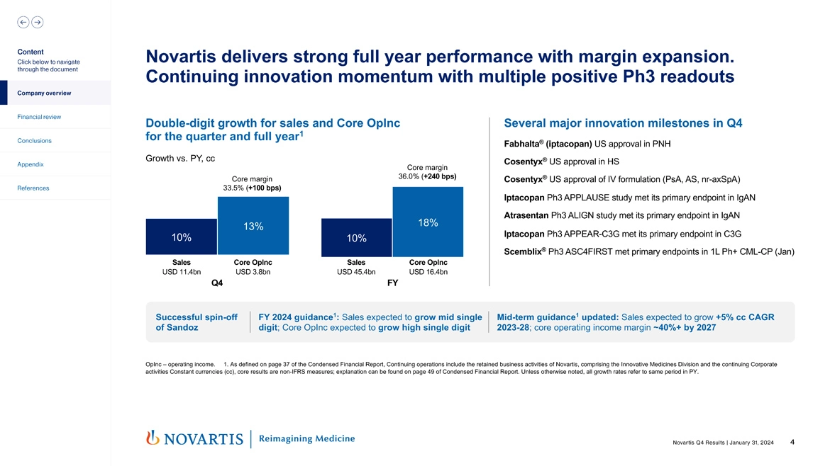 We also had the successful spin-off of Sandoz as a really value-creating event for Novartis and our shareholders. We provided our updated 2024 guidance, where we expect to grow mid-single digit and Core OpInc expected to grow high single digit, and we've chosen to be prudent with this guidance at this point in time.
