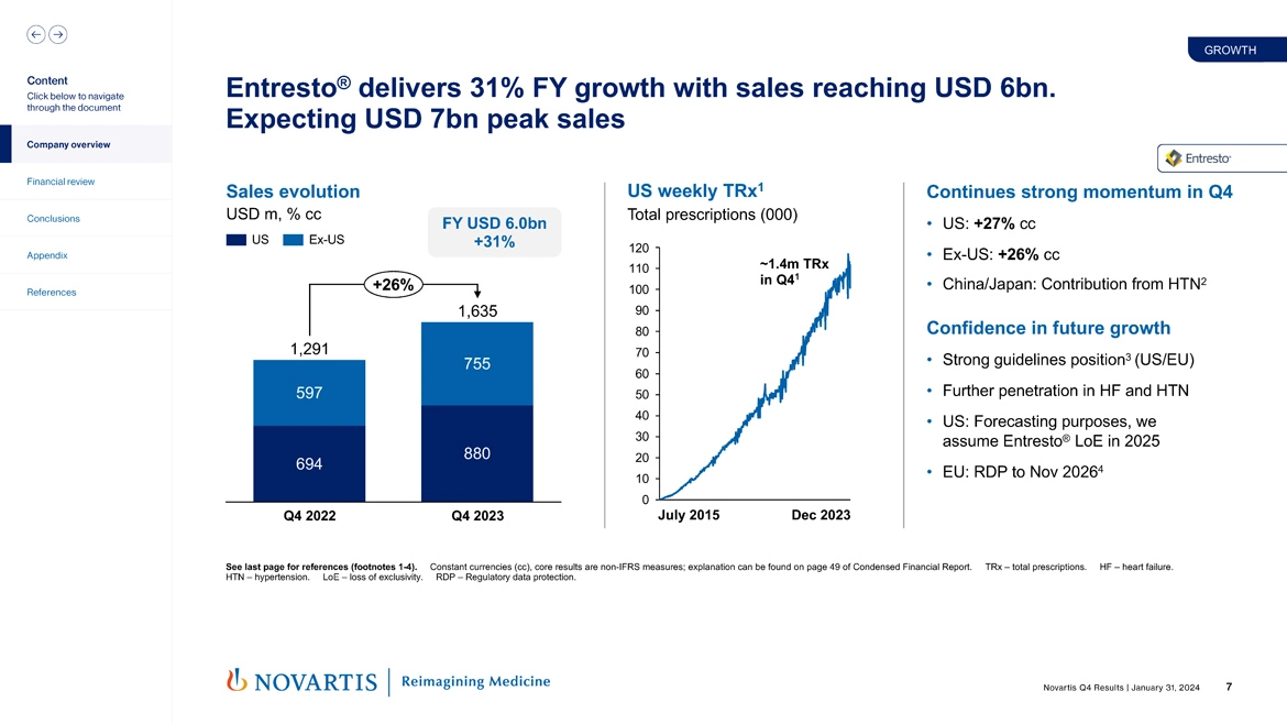 And moving to Slide 7. And I want to just walk through each of the brands to give you some perspectives and then look forward to taking your questions. So first, Entresto delivered 31% growth with sales reaching USD 6 billion, and we're well on track to reach our peak sales goal of USD 7 billion plus. This growth was both in the US and ex-US geographies. You can see on our weekly TRx, we continue to reach record highs. We had constant currency growth of 27% and 26% in US and ex-US and China and Japan contributed strongly with strong performance with our ongoing hypertension launches.