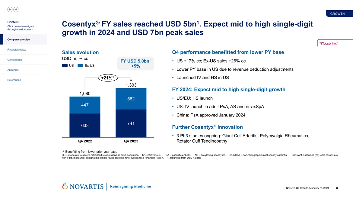 So moving to Slide 8. Now, Cosentyx® reached USD 5 billion in 2023. And we expect to see at least mid- to high single-digit growth in 2024 on our way to our guidance of USD 7 billion peak sales. Going a little deeper into this performance, we saw a 17% growth in the US and 26% outside the US. This was in part in the US due to revenue deduction adjustments we had in the prior year leading to a lower base.