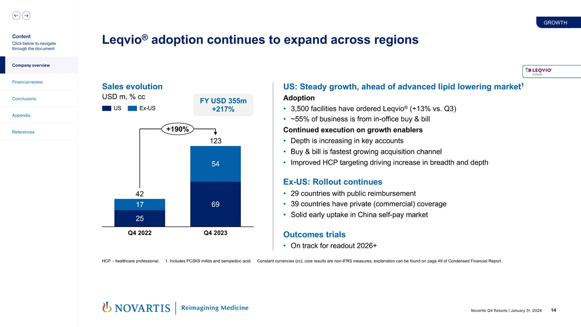 Now moving to Slide 14. Leqvio® continued its steady expansion in the US as well as across regions. You can see here, we delivered USD 123 million on the quarter growth in both our international and our US business. On the US side, we have 3,500 facilities now ordering Leqvio®, which is a 13% growth versus quarter 3. 55% of that business now is coming from in-office buy and bill. And we expect to continue to drive growth on this brand by driving depth in our key accounts as well as expanding the buy-and-bill acquisition channel.