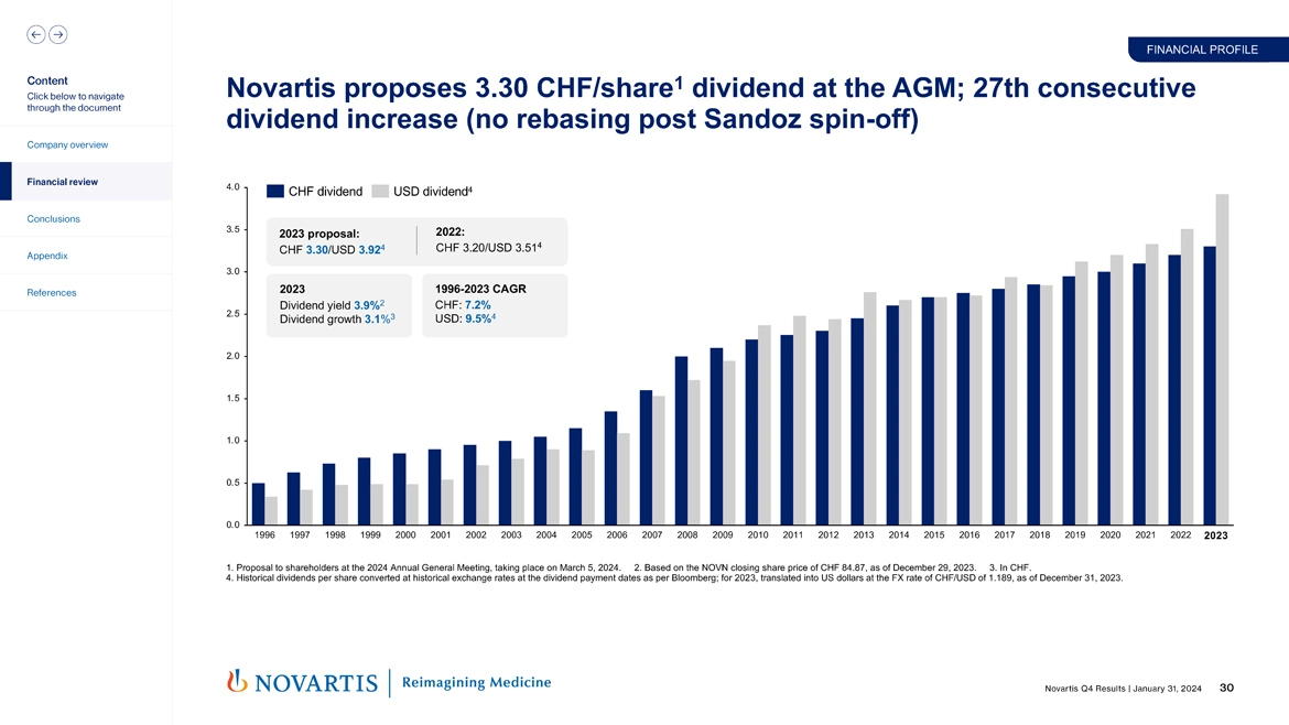 Speaking of the dividend, let's go to the next page. Yes, we are pleased to propose the 27th consecutive dividend increase to CHF 3.30 per share and US dollars even USD 3.92, and this is based on the CHF 3.20 last year. So an increase of 3% in Swiss francs and 12% in US dollars with a dividend yield reaching close to 4%. And it's fully in line with our policy of increasing our dividend every year in Swiss francs per share without rebasing post-Sandoz spin.