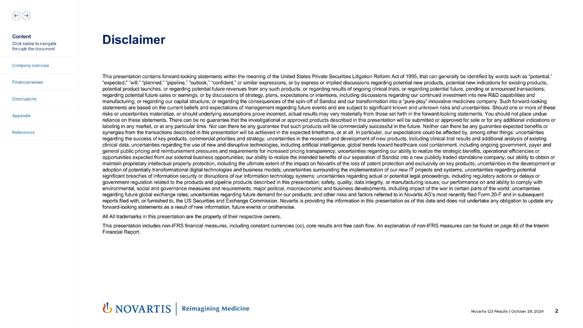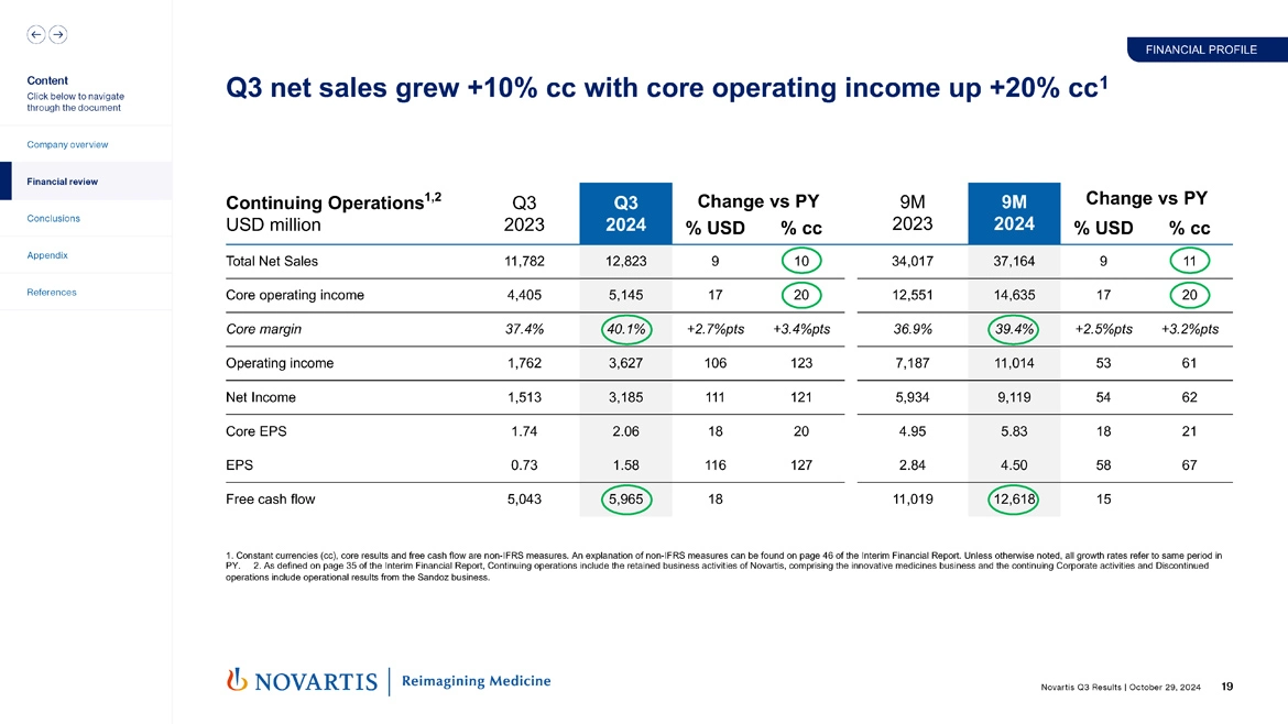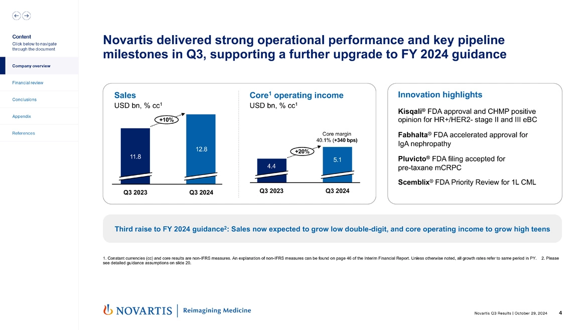 So moving to slide 4. You saw this morning that Novartis delivered strong operational performance in Q3, really continuing now what's been two years of very strong operating performance for the company. Sales grew 10%. Core operating income was up 20% in constant currencies. In the quarter, our core margin went all the way up now to 40.1%. And we also had important innovation highlights, which we'll talk about a bit more over the course of the call. Kisqali® FDA approval and CHMP positive opinion in hormone receptor positive HER2-negative stage II and III early breast cancer, our Fabhalta® accelerated approval in IgA nephropathy.