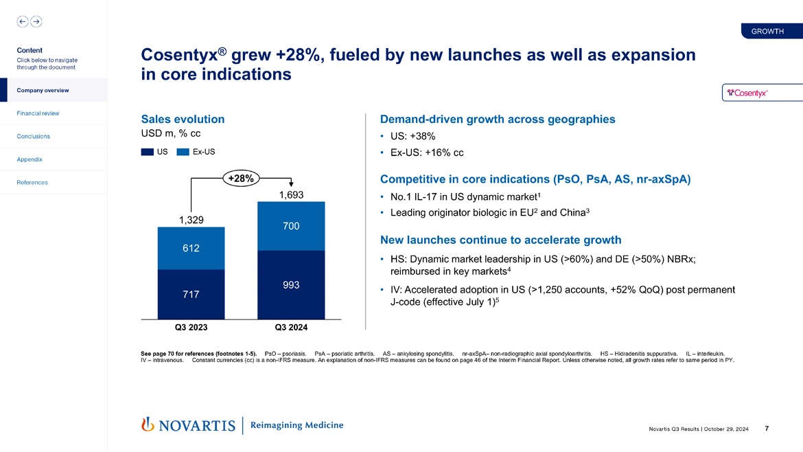 So moving to slide 7. Cosentyx® grew 28%, and this was primarily driven by the strong performance we've had in our new launches in HS and in the IV formulation. You can see 28% growth overall, but driven by very strong performance in the United States of 38% outside the US, 16% in constant currencies. We remain the number one IL-17 in the US dynamic market, and we're the leading originator biologic now in the EU and in China.