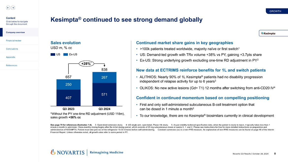 Now moving to slide 8. Kesimpta® continued to see strong demand globally, and it's a unique profile that this medicine provides for patients and physicians. So 28% growth. But when you strip out the onetime RD adjustment that we had from a European market last year, our sales growth was 56% in constant currencies. We now have over 100,000 patients treated worldwide either naive or first switch. The US, our TRx volume growth was 38% versus prior year, gaining 3.7% share. Ex US, we had strong underlying growth, excluding the onetime RD adjustment from last year.