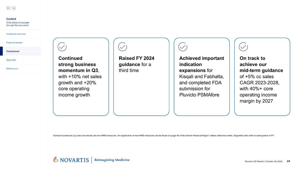 So moving to slide 24. In summary, we see continued strong business momentum in the quarter and I think the numbers speak for themselves, the 10% and the 20% growth. We raised our full year 2024 guidance for the third time just showing the underlying momentum we're seeing across our growth drivers and new launches. We continue to deliver on our pipeline building off of 10 Phase III readouts – positive Phase III readouts with indication expansions of Kisqali®, Fabhalta® and the submission of Pluvicto® PSMAfore. And we're well on track to achieve our midterm guidance of 5% sales growth '23 to '28 and 40% plus operating income margin by 2027.