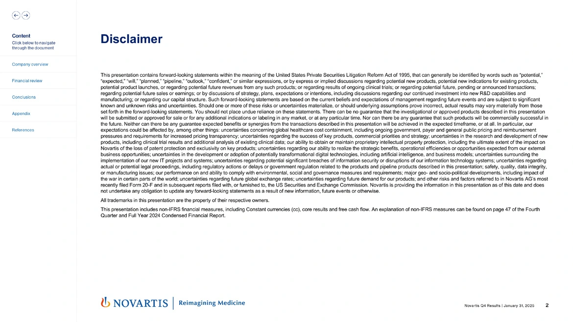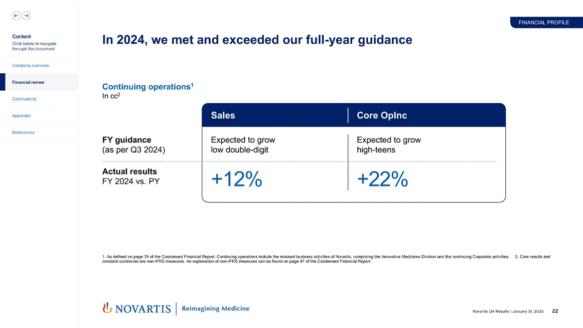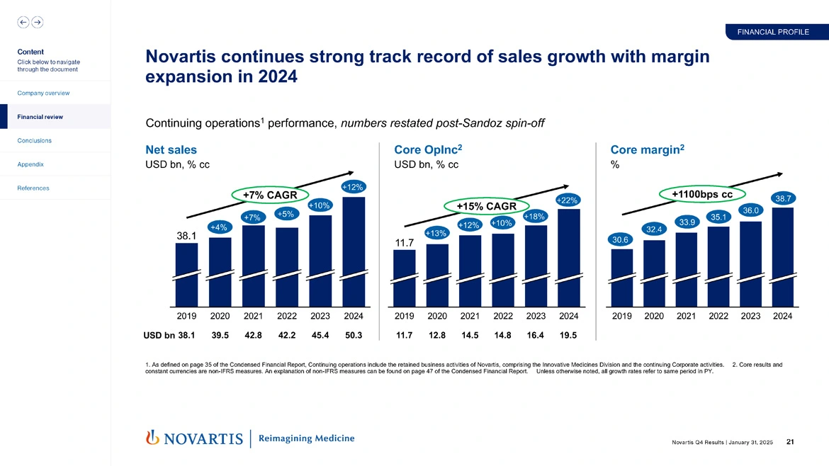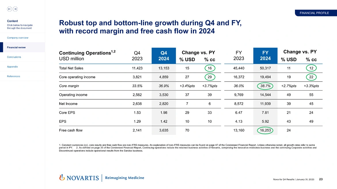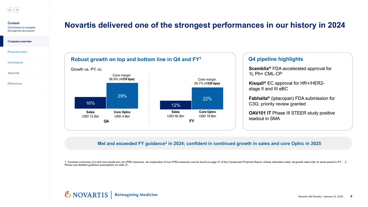 So moving to slide 4. As you saw this morning, Novartis delivered one of the strongest performances that we've had in our history in 2024. When you look at quarter four, our sales grew 16% and core operating income grew 29% in constant currency. And on the full year, we had 12% sales growth and 22% core operating income growth with our margin reaching 38.7%, well on our way to our goal of 40% plus margin.