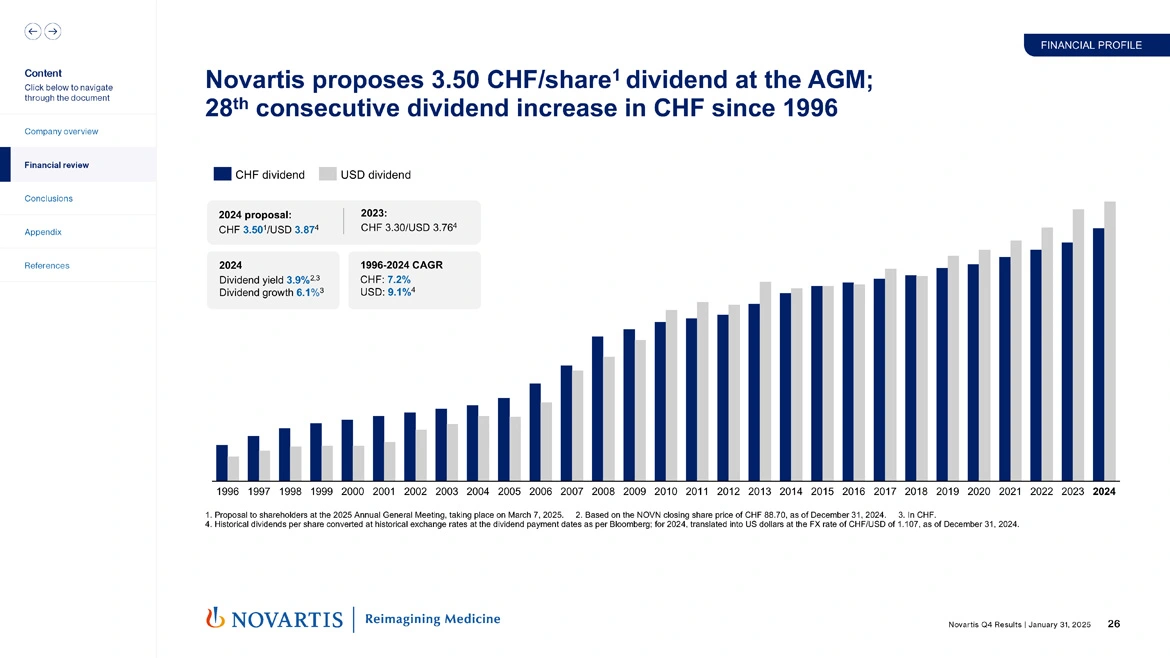 Now, on to the next slide, please, to the dividend. So we are really pleased to propose the 28th consecutive dividend increase to CHF3.50 per share. an increase of 6% in Swiss francs and 20 Rappen after the prior few years of 10 Rappen per year. As you know, we did not rebase our dividend for the spin-off of Sandoz, nor Alcon. So this represents really an attractive, consistent growth over time, in line with our commitment to our shareholders.