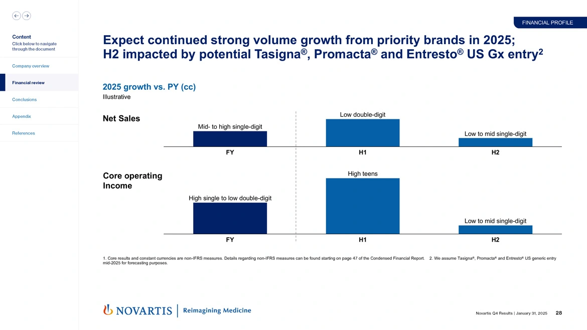 On slide 28, we have shown illustratively how we expect half one and half two dynamics should generics for Entresto®, Tasigna® and Promacta® enter in US in mid of 2025 as per our financial planning assumption. Overall, we expect continued strong volume growth from priority brands in 2025. In half one, we expect sales to grow low double digit while we expect, of course, a softer half due to the impact of the three potential generic entries with low to mid-single-digit sales growth. Likewise, we expect half one corp inc to grow the high teens versus low to mid-single-digit growth in half two.