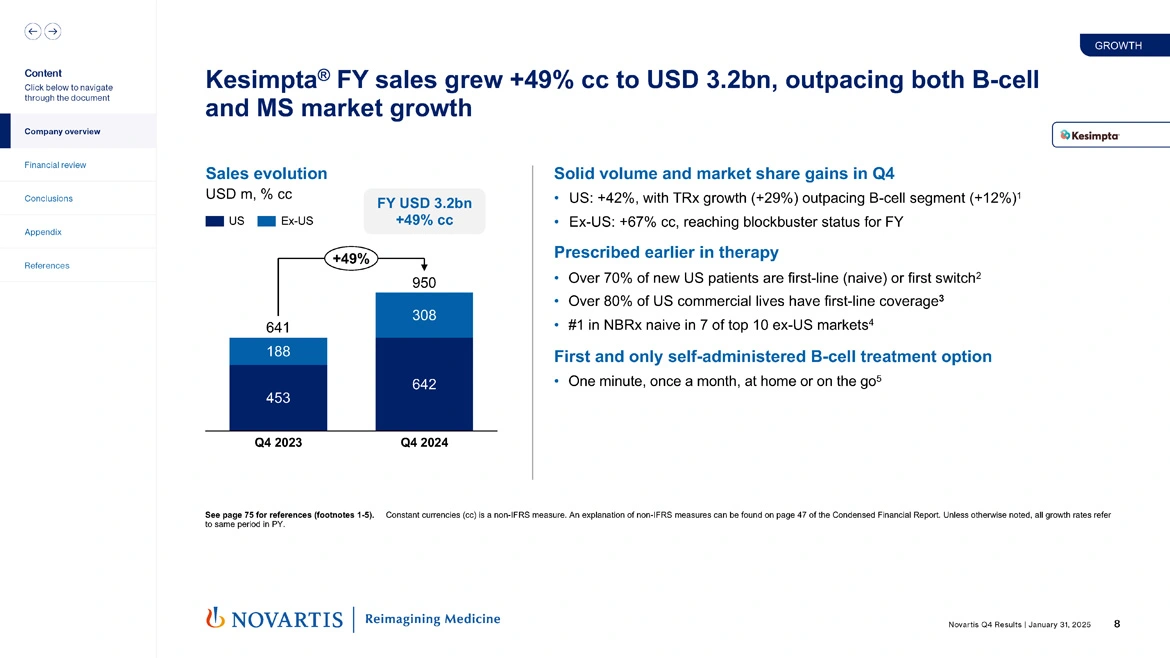 Now, moving to slide 8. Kesimpta® grew 49%, reaching USD 3.2 billion on the full year. It was outpacing both the B cell and the MS market. We're really pleased by the performance in the US and also very solid performance outside of the United States, growing 42% in the US with TRx growth at 29%. We're outpacing the B-cell segment. We see our NBRx share in the high 20s in the B-cell segment. Outside of the United States, we had 67% constant currency growth, which we're really pleased with.