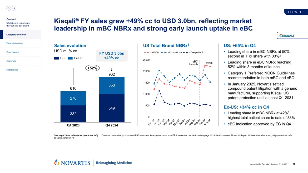 Now, moving to slide 9. Kisqali® grew 49% in the full year, reaching USD 3 billion in sales, and this is a reflection of both of the strong performance we're seeing in the metastatic setting and in the early breast cancer setting. So as you can see in the middle panel here, we've outlined the total brand NBRx across the market, and you can see the significant increase we've seen in total brand NBRx post the approval in early breast cancer and the positive NCCN guidelines. The brand grew 65% in the US in quarter four. We have metastatic share at 50% now and TRx share at 33% and climbing.