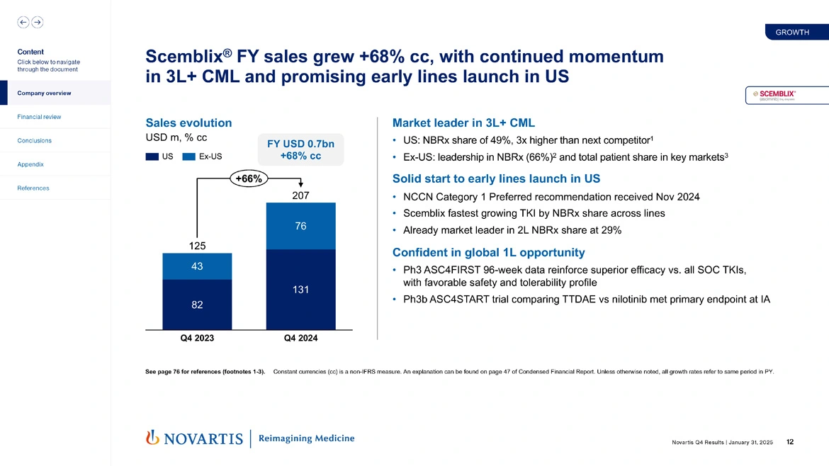 We also had important pipeline highlights in the quarter, including Scemblix® and Kisqali®, which we'll go through in more detail later on in the call. Overall, we met and exceeded our full year guidance in 2024, and we're confident in continued growth in sales in core op inc in 2025, as Harry will outline later in the call.