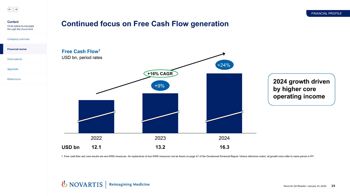 Now, speaking of free cash flow, let's turn to the next slide. You can see free cash flow generation has really accelerated since we completed our transformation into a pure-play pharma company end of 2023 and also finalized our transformation program, Transformation for Growth program, which we announced April '22. This has been a focus for us to, of course, ensure that not only core operating income increases, but appropriately also free cash flow, so high quality of core earnings and strong free cash flow generation.