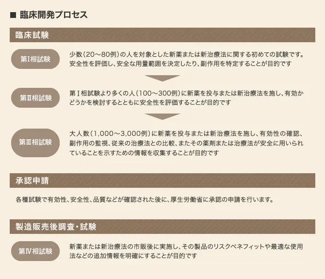 開発は製造販売の承認を得るために必須の臨床試験(治験)を実施する仕事です。治験薬をヒトに投与して、用法・用量を検討し、有効性や安全性について調べます。臨床試験の実施計画立案、医療機関の選定・依頼・契約、モニタリング、結果の統計解析、報告書の執筆と幅広い仕事の領域があります。また、製造販売の承認を得た後も、安全性についてさらに詳しい調査をします。臨床試験はその目的別に、第Ⅰ相試験から第Ⅳ相試験に分けられています。臨床試験はGCP(医薬品の臨床試験の実施基準)に則って進める必要があり、臨床開発に携わるには、このルールを熟知しておくことが大切です。