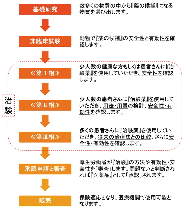 国(厚生労働省)から新しい薬(「医薬品」といいます)として承認を得るために、健康な人や患者さんの協力を得て行われる臨床試験のことを『治験』、治験で使われる薬を『治験薬』といいます。