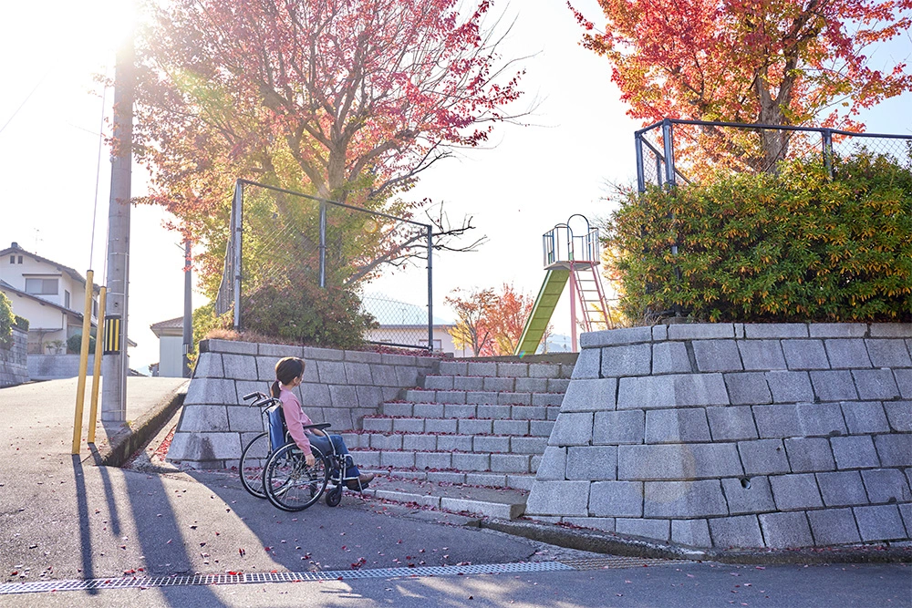 「車いす用のスロープを設計される方は、実際に車いすに乗ってみて体験してほしいですね。そうすれば、どれくらいの勾配のスロープならば無理なく進めるのかわかると思うので。坂道も大変ですが、車いすで段差を上がるのは本当に難しいです。かなり練習をしましたが、数センチがやっとで、普通の階段はとても無理ですね」