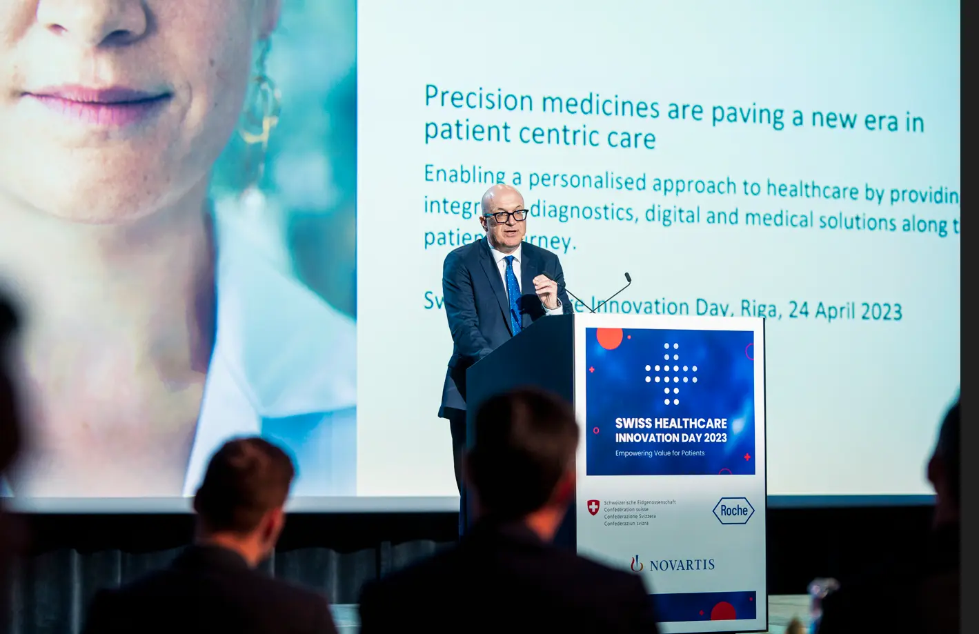Konferencē “Šveices Veselības inovāciju diena 2023. Veicinot ārstniecības iespējas pacientam”, kas notika 24. aprīlī Rīgā, Šveices veselības aprūpes sistēmas un farmācijas jomas speciālisti un Latvijas ārstu, pacientu un veselības aprūpes iestāžu pārstāvji diskutēja par to, kā veselības aprūpes sistēmā nodrošināt agrīnu piekļuvi jaunākajām tehnoloģijām, tādējādi uzlabojot pacientu ārstniecības rezultātus un efektivizējot veselības aprūpes sistēmas izmaksas. “Inovācijas ne tikai spēj glābt cilvēku dzīvības, bet arī palīdz ievērojami ietaupīt naudu. Tas ir aktuāli katrai valstij un katrai valdībai,” sacīja Šveices vēstnieks Latvijā, Lietuvā un Igaunijā Martins Mišlē (Martin Michelet), atklājot konferenci. Konferenci rīkoja Šveices vēstniecība Latvijā, Igaunijā un Lietuvā sadarbībā ar Šveices farmācijas uzņēmumiem Novartis Baltics un Roche.
