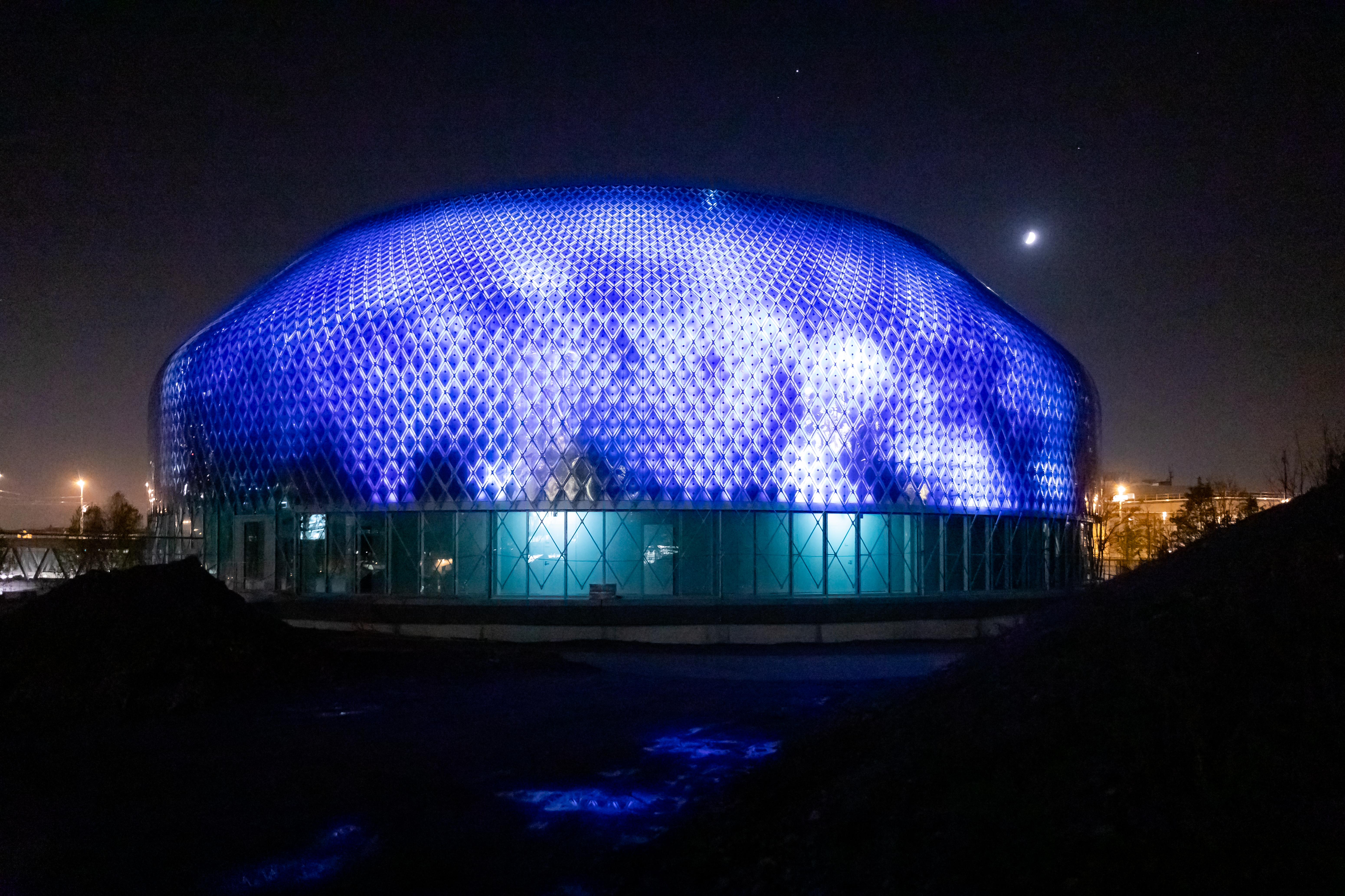 Illumination of zero-energy media facade of the Novartis Pavillon.