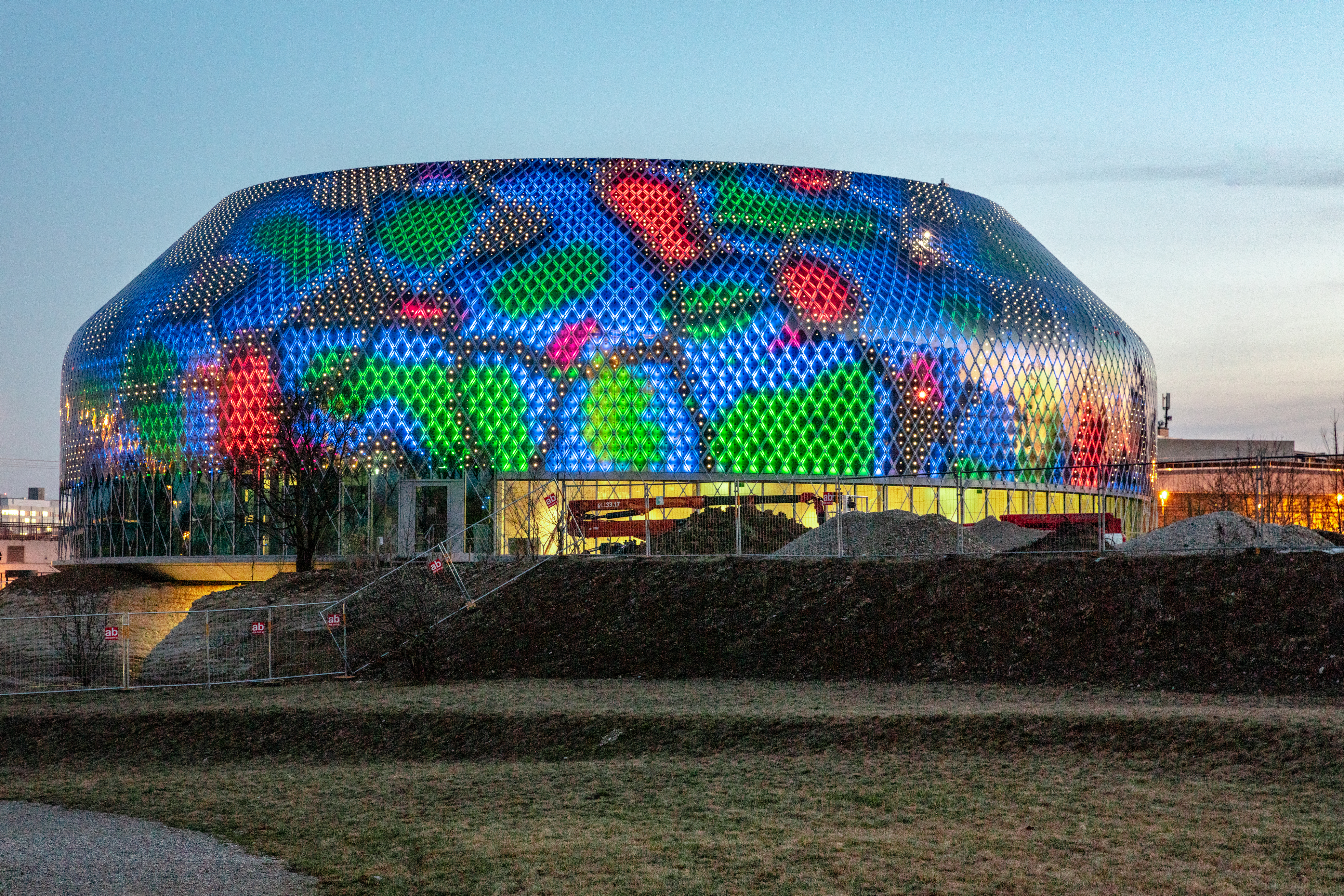 Illumination of zero-energy media facade of the Novartis Pavillon – artwork by Semiconductor.