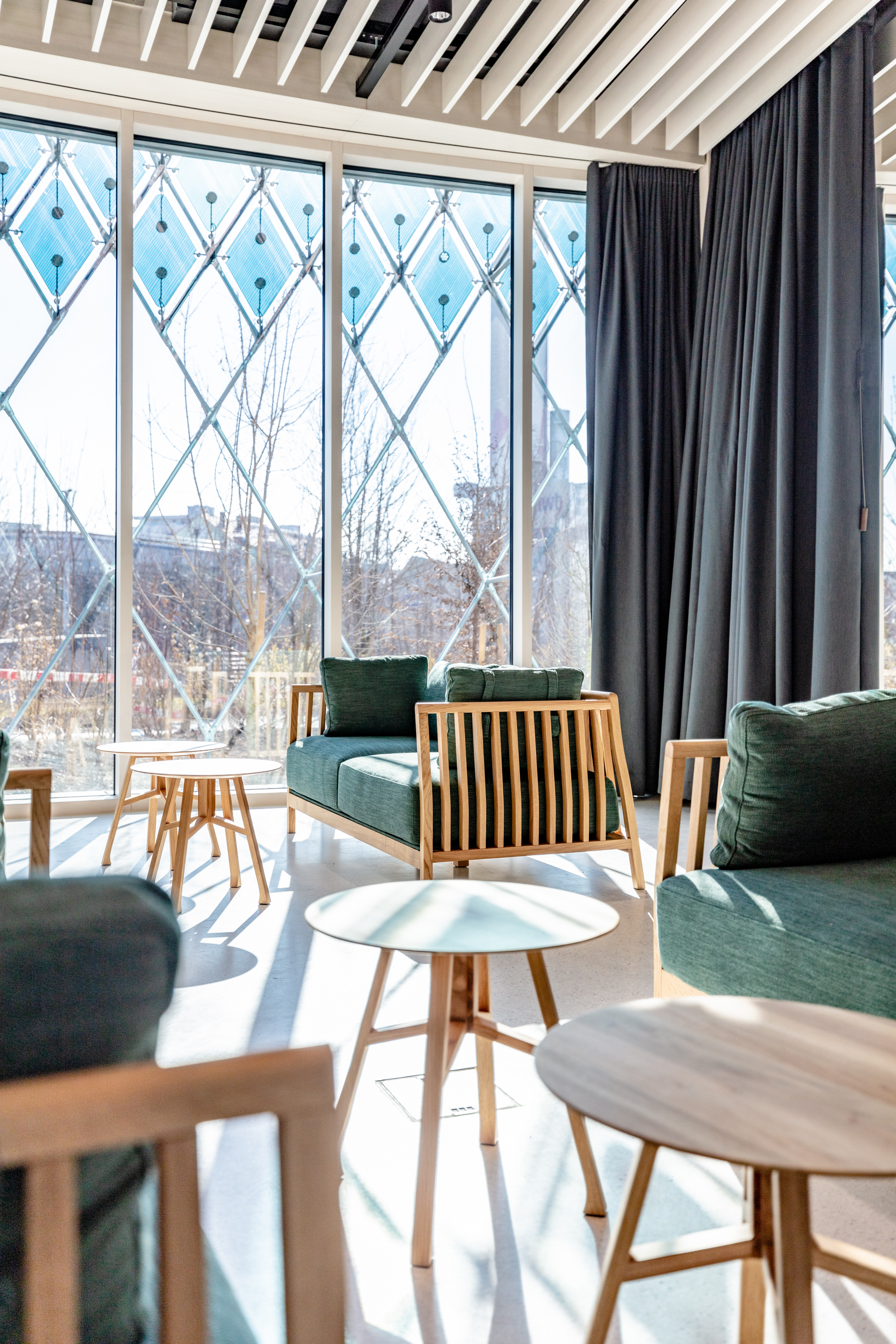 Interior view on the ground floor of the Novartis Pavillon. Lobby set-up in the event space on the ground floor of the Novartis Pavillon.
