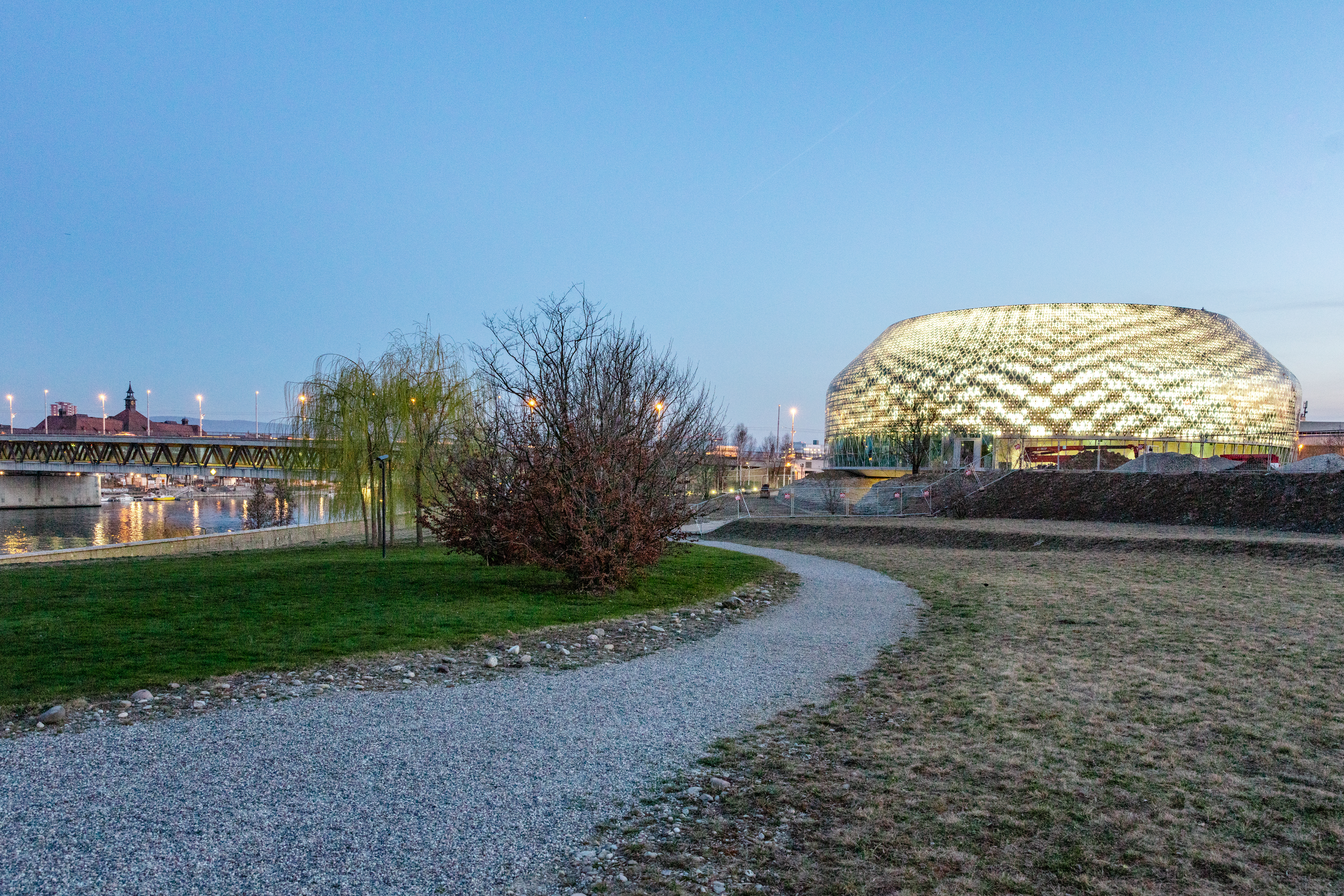 Novartis Pavillon located in Park South of the Novartis Campus. Illumination of zero-energy media facade of the Novartis Pavillon – artwork by Esther Hunziker.