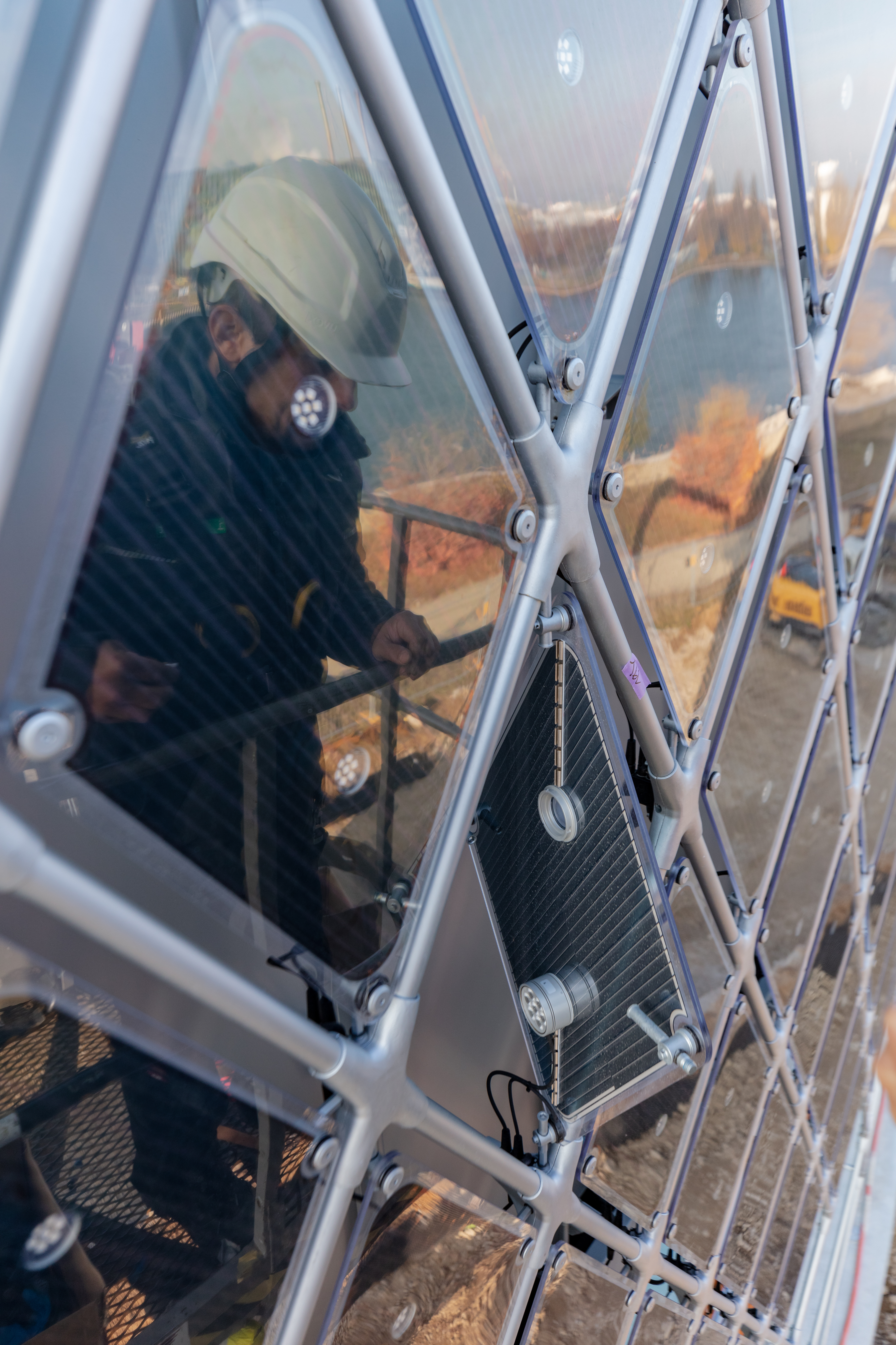Organic solar cell with LED core which builds the illuminating skin of the Novartis Pavillon.