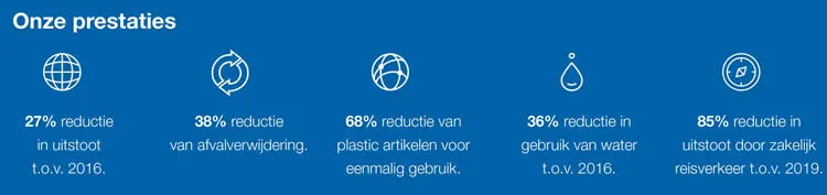 ons onder meer langs het gebruiken van enkel groene energie, toepassen van duurzame thermische technologieën, ons wagenpark verkleinen en verduurzamen, minder zakenreizen per vliegtuig en het gros van onze vracht vervoeren over zee. We verduurzamen onze inkoop van producten, bijvoorbeeld door geen ‘single use plastic’ producten meer te gebruiken. De natuurlijke hulpbronnen die we nodig hebben voor onze productie, zoals water, gebruiken we spaarzaam, veilig en verantwoord. Dat gebruik monitoren we continu en stellen we bij waar dat kan of nodig is.