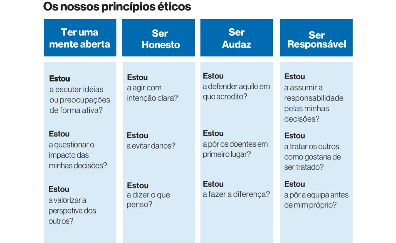 Lançado em setembro de 2020, o nosso Código de Ética centra-se no compromisso de corresponder às expectativas dos doentes, dos colaboradores, dos acionistas, dos profissionais e instituições de saúde e da sociedade. Esta é uma ferramenta que nos guia na tomada de decisões do dia-a-dia, garantindo que agimos sempre com integridade.