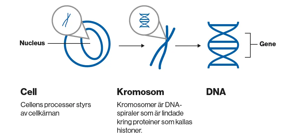 Varje människa har cirka 20 000 gener och två uppsättningar av varje gen – en från vardera förälder. Små variationer i generna avgör en människas utseende och potentiellt också hälsa.1