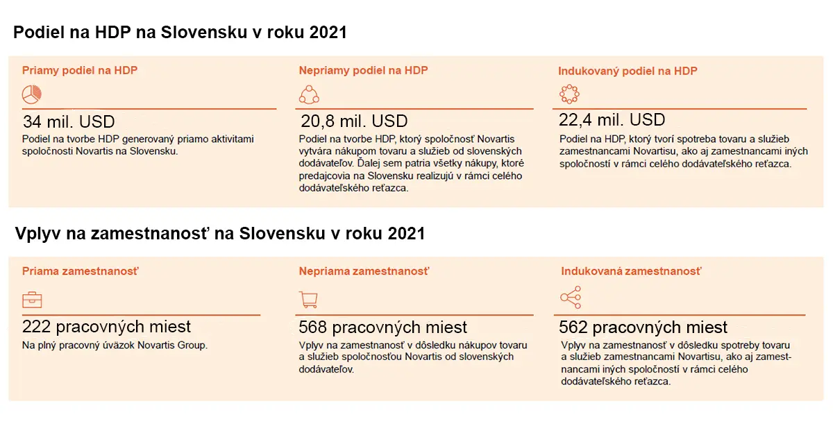 Do aktivít našej spoločnosti na Slovensku bolo zapojených 1352 ľudí, z toho 222 tvorili naši vlastní zamestnanci. Celkové číslo dopĺňajú spolupracovníci v celom našom dodávateľskom reťazci a zamestnanosť v dôsledku spotreby tovarov a služieb zamestnancami spoločnosti Novartis, ako aj iných spoločností v rámci celého dodávateľského reťazca.