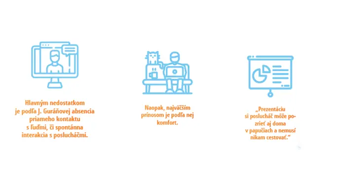 „Hlavným nedostatkom je absencia priameho kontaktu s ľuďmi, či spontánna interakcia s poslucháčmi. Naopak, najväčším prínosom je komfort. Prezentáciu si poslucháč môže pozrieť aj doma v papučiach a nemusí nikam cestovať,“ hovorí Janka Guráňová.